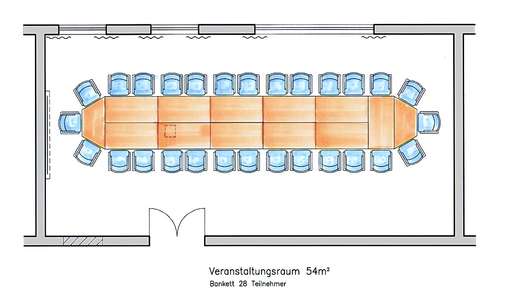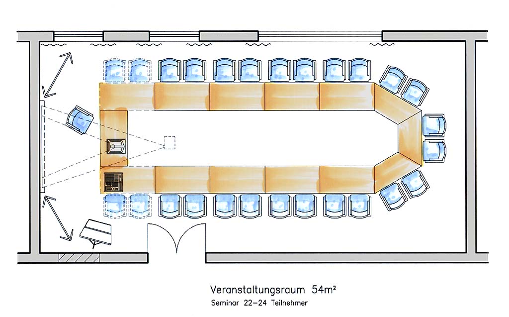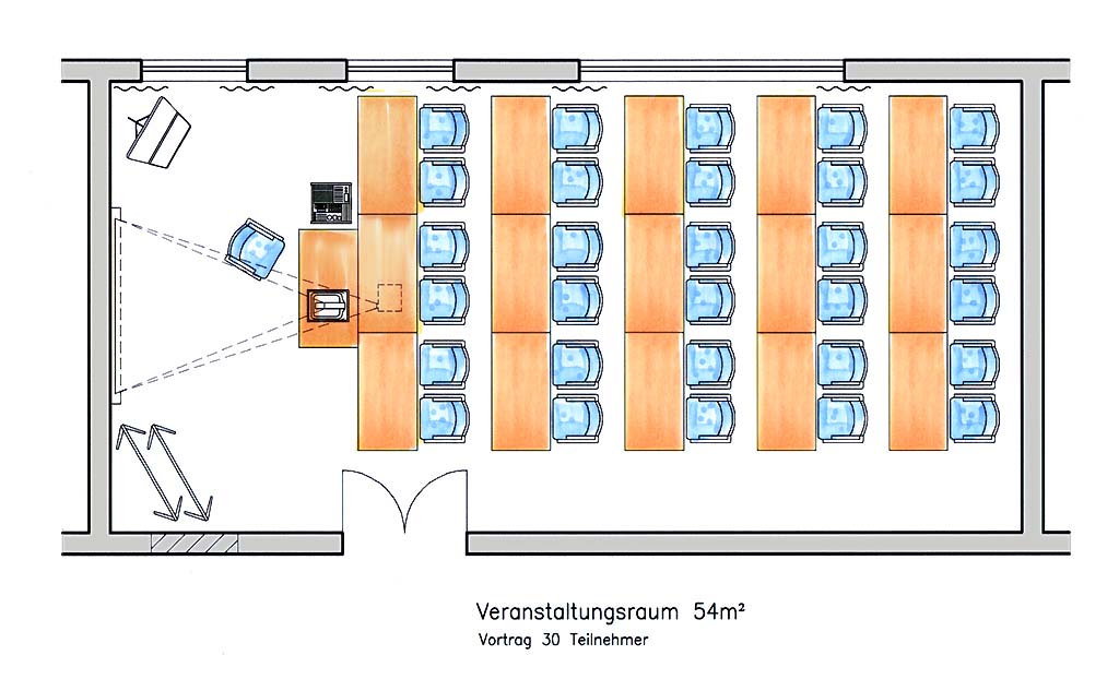 Ausgestattet mit folgendem Präsentationsequipment: Overheadprojektor, Leinwand, Flipcharts, Pinwände, Rednerpult und einem Beamer.